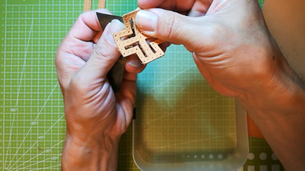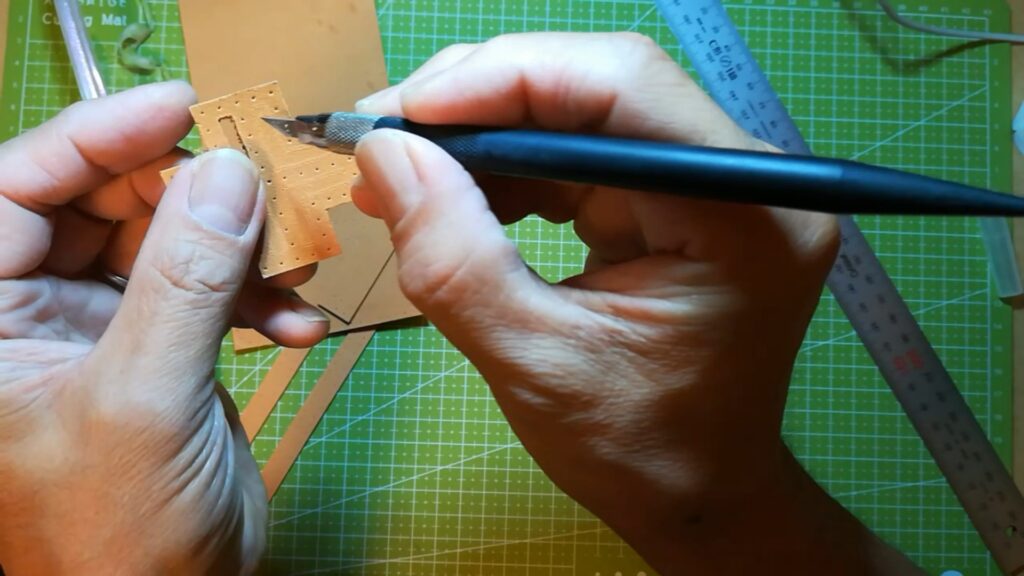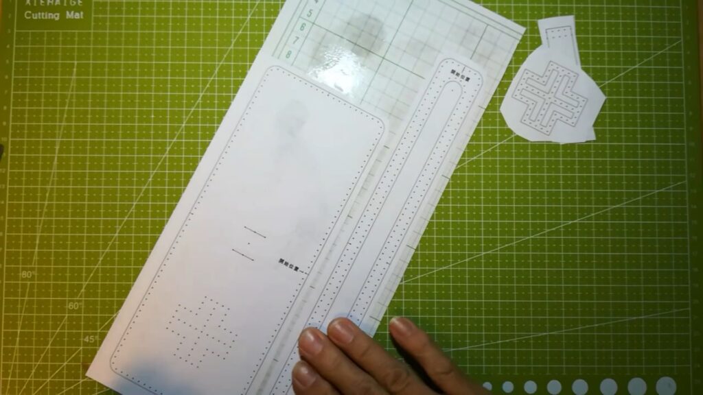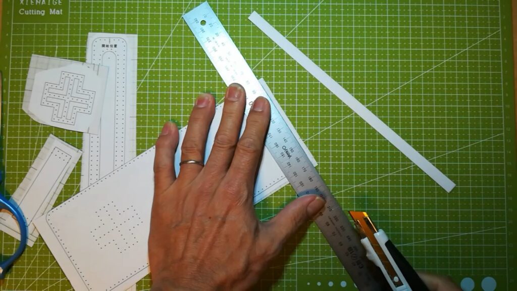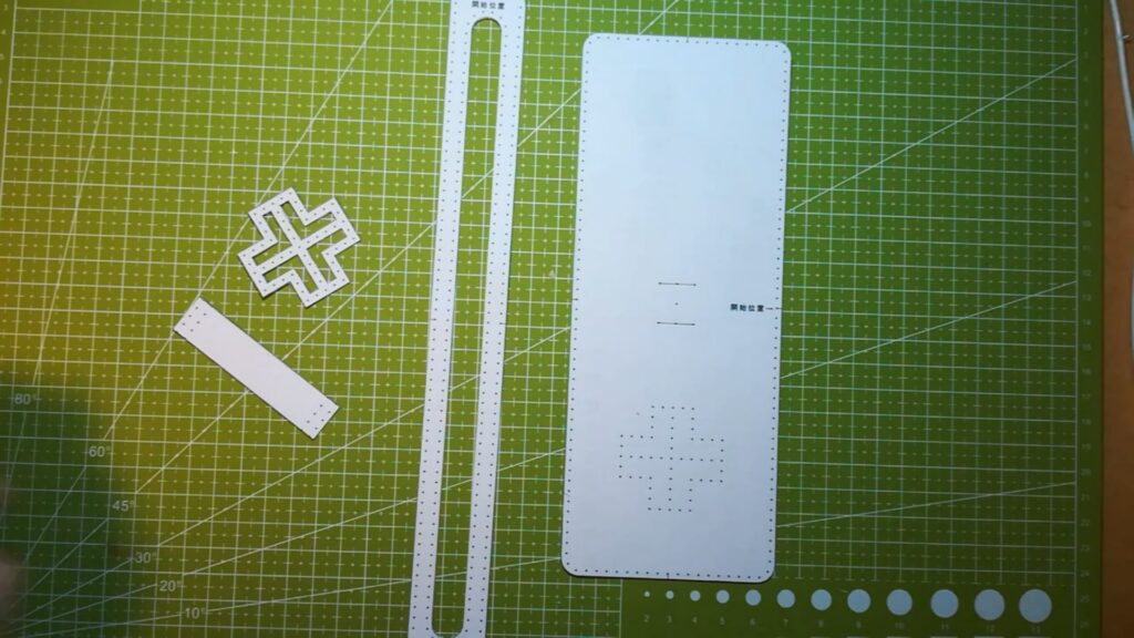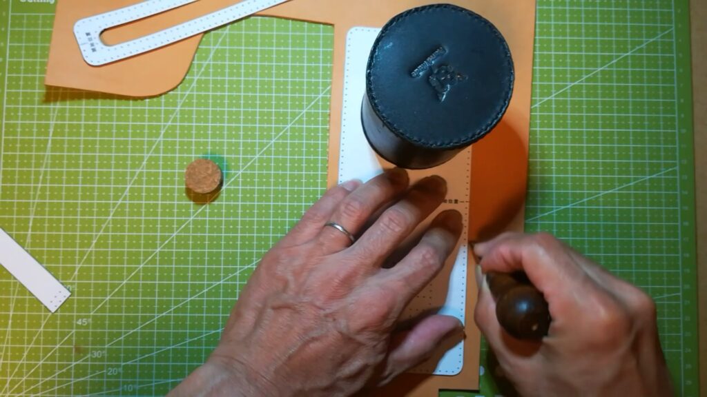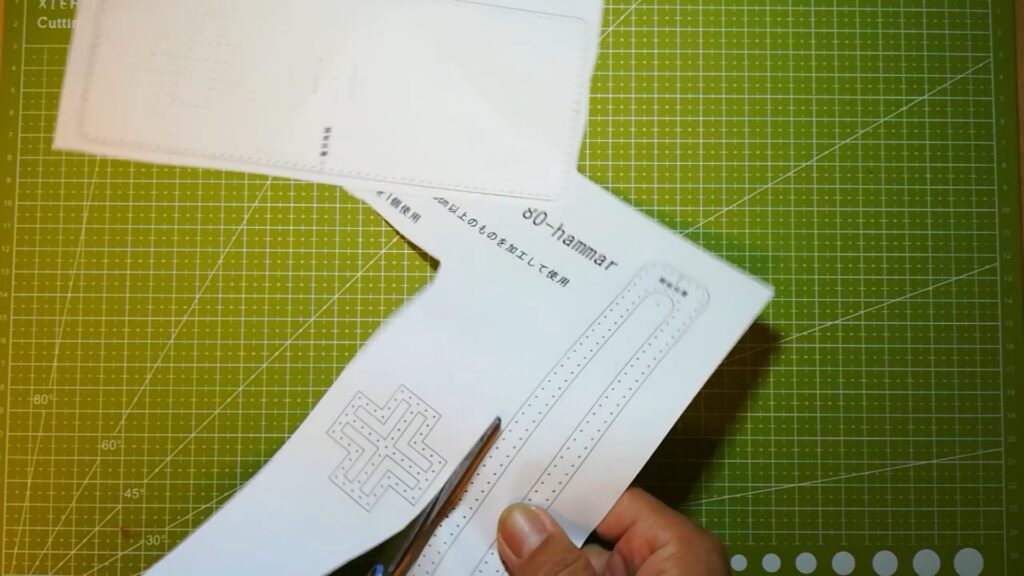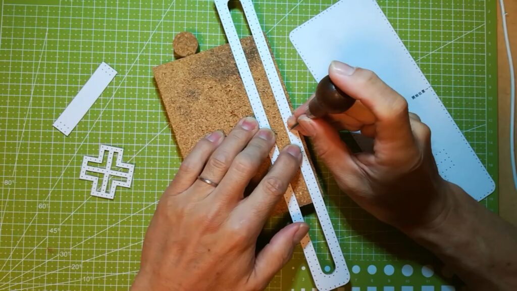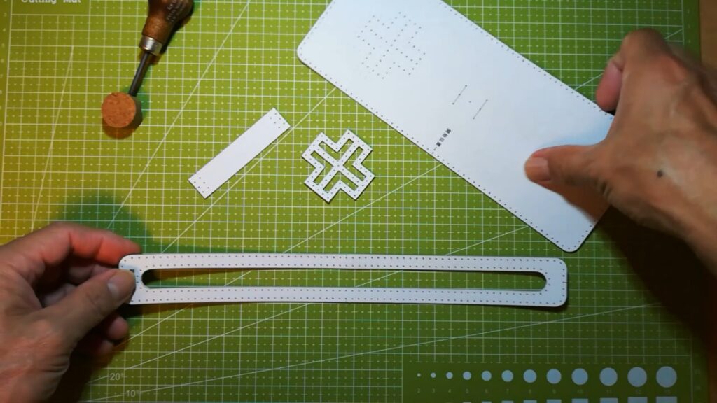 型紙のパーツが切り出せたら次に手縫い穴の点を目打ちなどで突いて開けます。